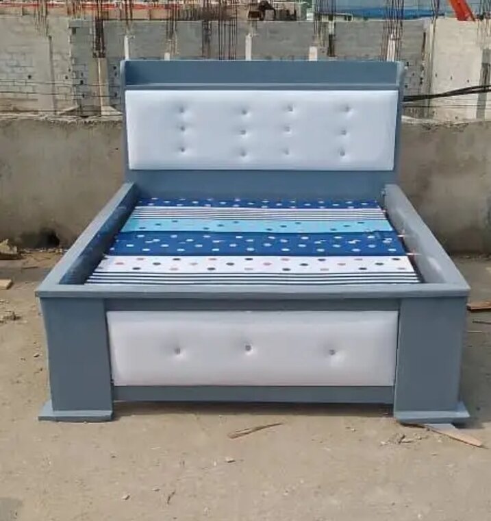 Lit gris moderne avec tête de lit et tiroir capitonnés. Conçu pour un confort optimal et un rangement pratique. Idéal pour la chambre à coucher.