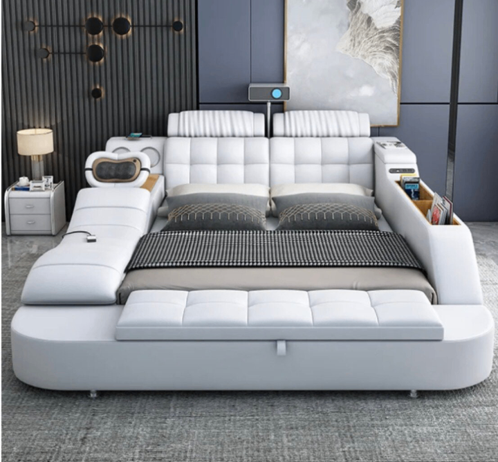 Découvrez ce lit moderne équipé de rangements intégrés, d'un éclairage ambiant et de fonctionnalités intelligentes pour un sommeil optimal. Conçu pour le confort et la praticité, il est idéal pour les chambres contemporaines.