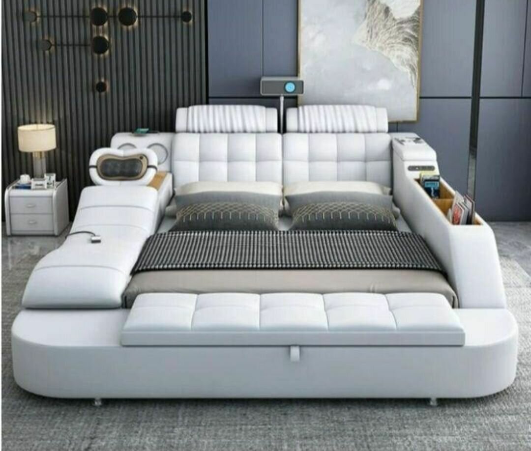Découvrez ce lit moderne doté de rangements latéraux et d'un éclairage intégré pour un confort optimal. Parfait pour une chambre contemporaine.