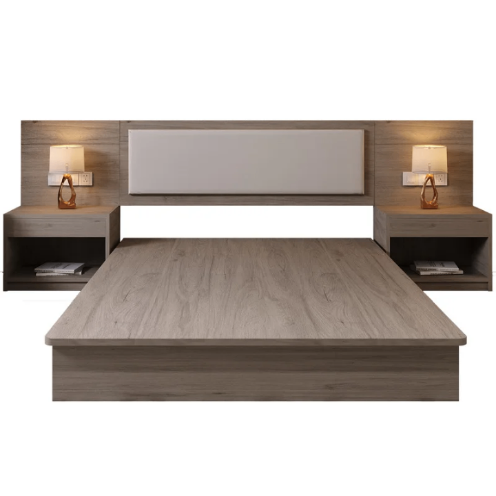 Découvrez un lit moderne alliant confort et style, doté de deux tables de chevet intégrées. Sa finition en bois raffiné et son design épuré ajoutent une touche d'élégance à votre chambre. Idéal pour une ambiance chaleureuse et fonctionnelle.