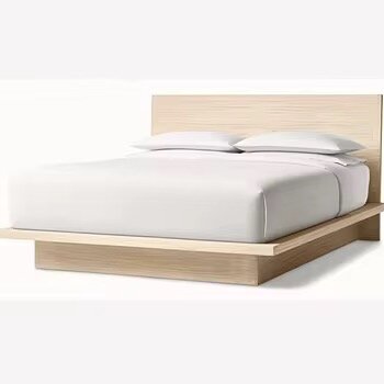 Lit moderne avec tête de lit en bois clair. Design minimaliste et élégant, parfait pour une chambre à coucher contemporaine.