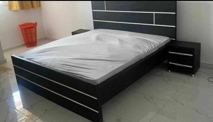 Lit contemporain avec tête de lit noire et matelas inclus. Design élégant et moderne pour une chambre à coucher confortable.