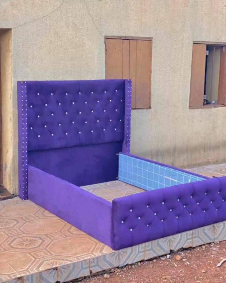 Lit violet capitonné avec tête de lit