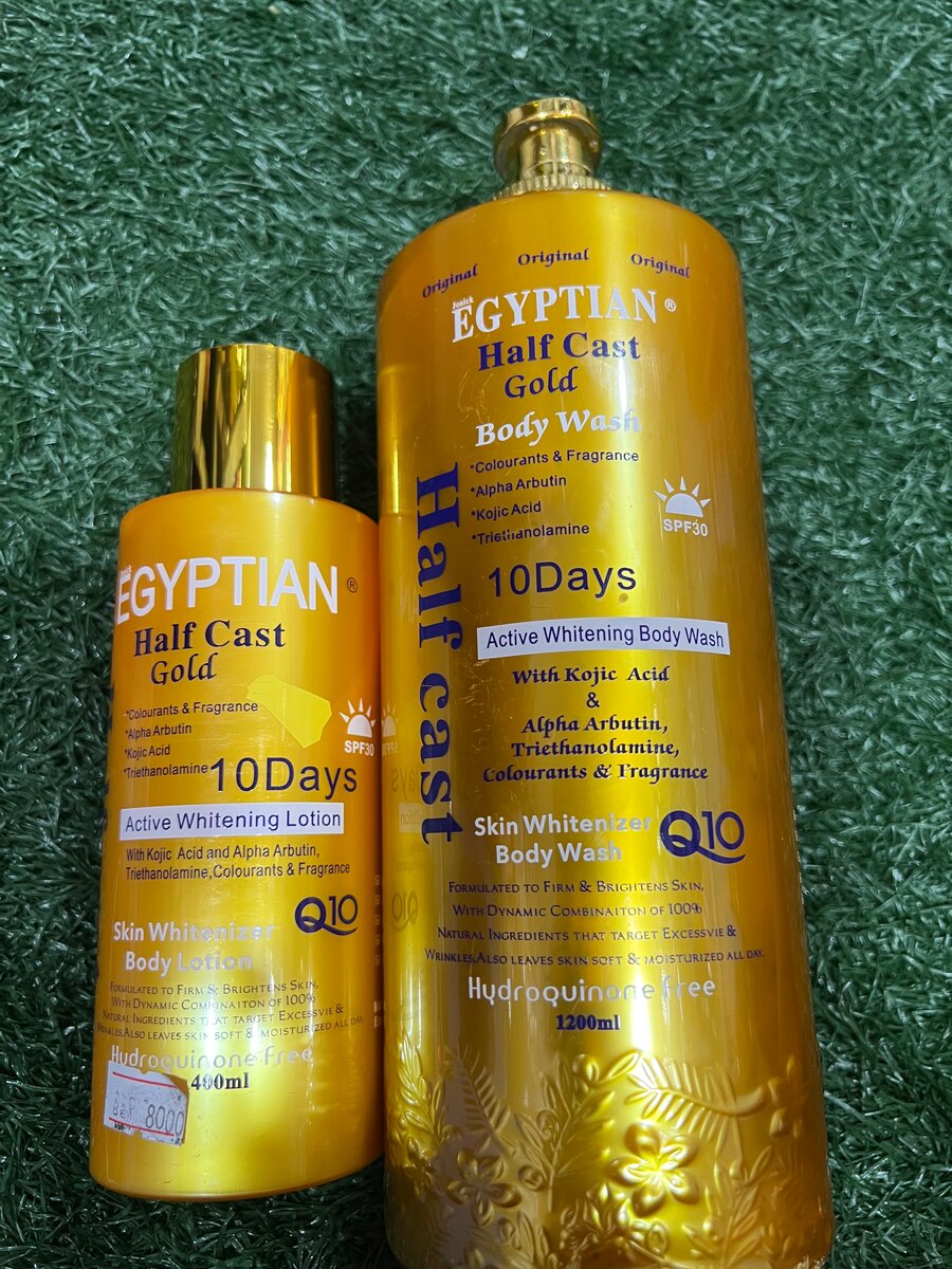 Transformez votre routine avec notre lot de soin corporel 'Egyptian Half Cast Gold', incluant un Savon et une lotion.