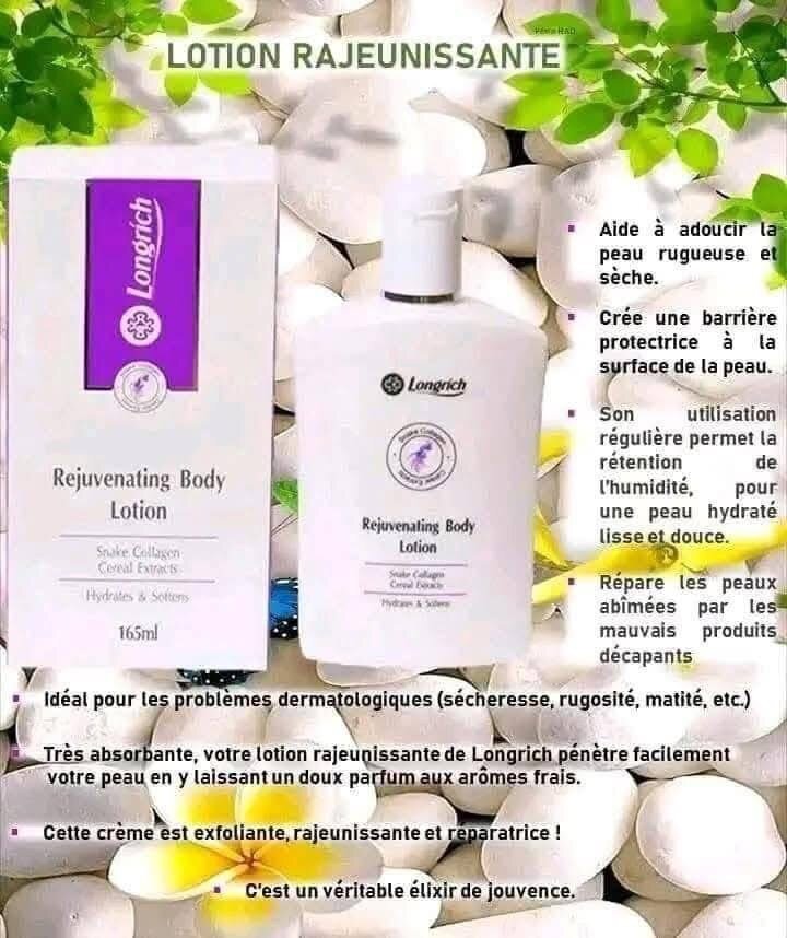 Découvrez la Lotion Corps Rajeunissante Longrich, formulée avec du collagène et des extraits de céréales. Cette lotion polyvalente adoucit la peau, améliore son élasticité et réduit les rides. Idéale pour une peau hydratée et douce au quotidien, elle est votre alliée contre le vieillissement et les marques disgracieuses. Un choix parfait pour une peau revitalisée et lumineuse.