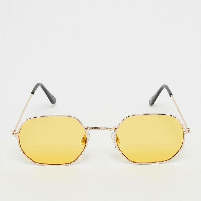 Élégantes lunettes de soleil avec verres jaunes et monture dorée. Parfaites pour un look rétro et unique. Adaptées pour les journées ensoleillées, elles offrent style et protection.