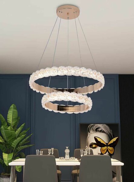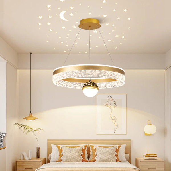 Ce lustre moderne avec LED intégrées transforme votre pièce en un ciel étoilé. Conçu pour un éclairage ambiant doux, il est idéal pour salons, chambres ou salles à manger. Sa forme unique et son fini doré ajoutent une touche d'élégance futuriste à tout intérieur.