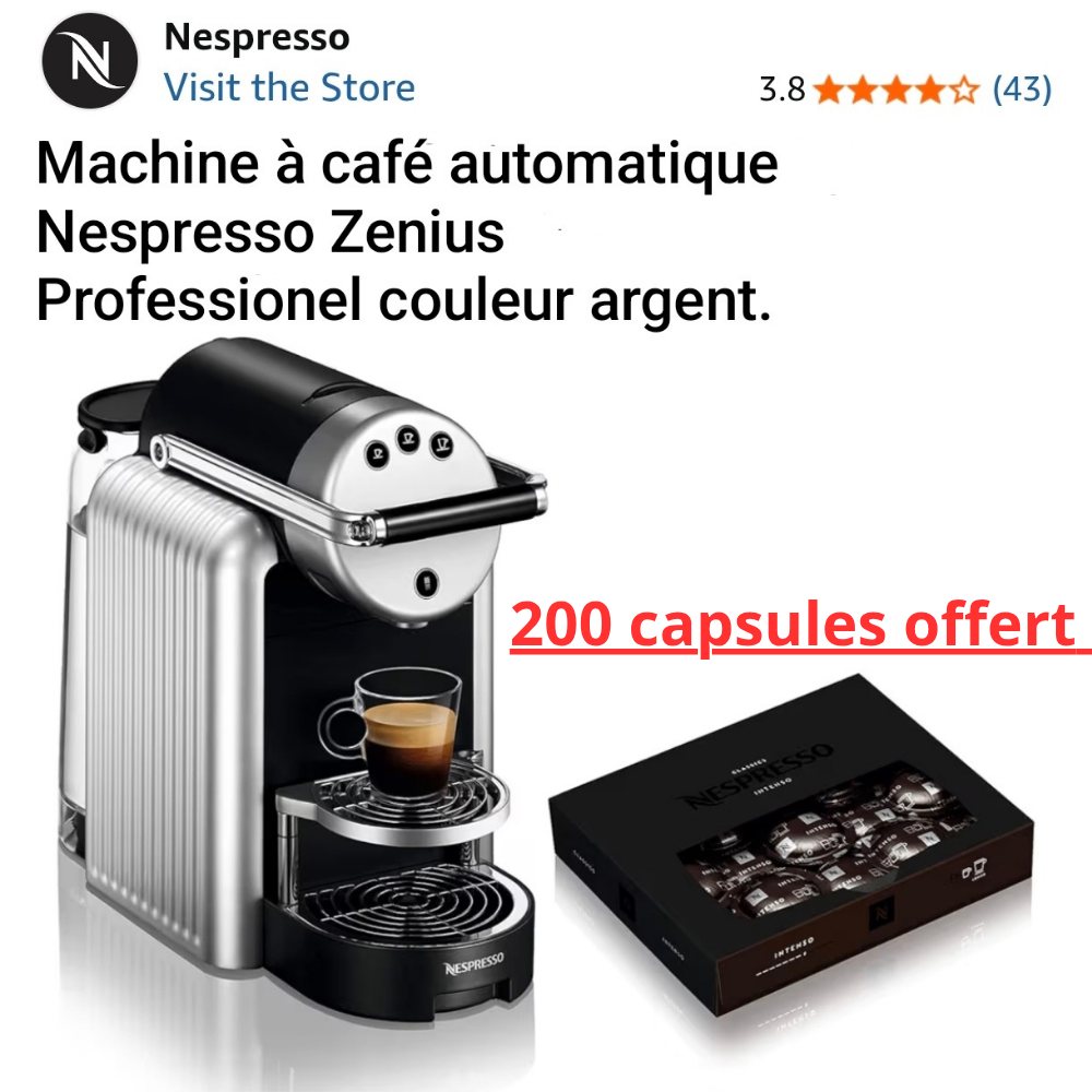 Découvrez la machine à café automatique Nespresso Zenius, couleur argent. Profitez d'un café professionnel avec un système automatique simple. Offre spéciale : 200 capsules offertes !