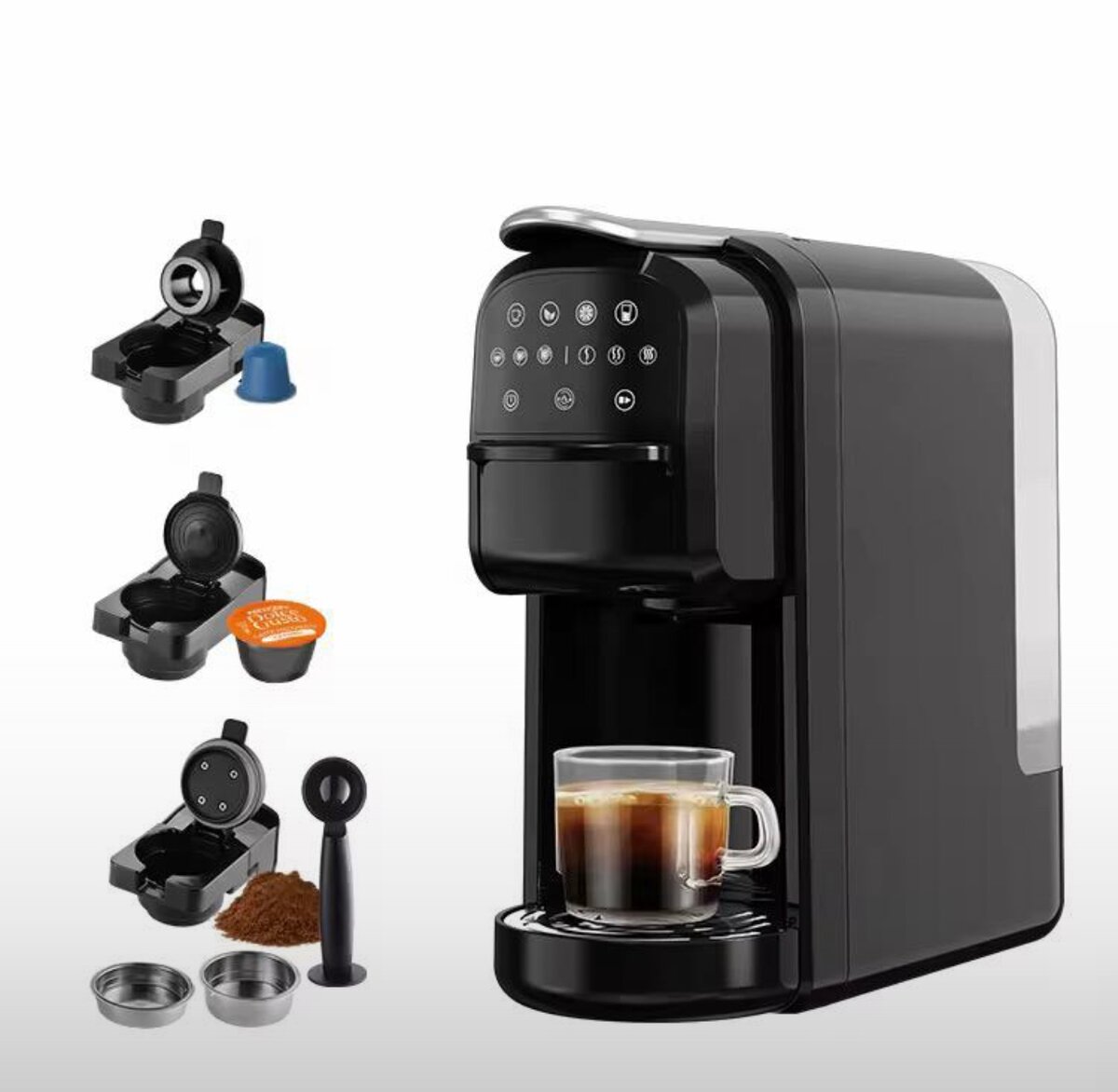 Découvrez notre machine à café multifonction idéale pour les amateurs de café varié. Compatible avec dosettes, capsules et café moulu, elle offre une flexibilité incomparable. Design moderne et compact, parfait pour toute cuisine. Préparez votre boisson préférée en un rien de temps avec un simple bouton. Un essentiel pour chaque foyer!