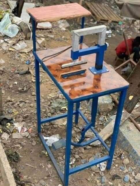 Machine à pédale pour découpe et rainurage. Durable avec cadre en acier et plateau en bois verni. Idéale pour ateliers artisanaux, offre précision et efficacité.