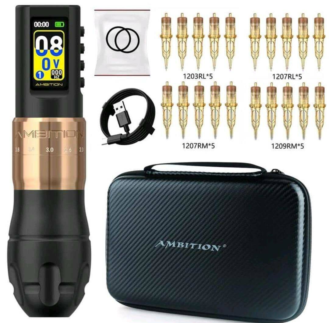 Découvrez la machine à tatouer sans fil Ambition, idéale pour les artistes professionnels. Avec son affichage numérique et ses cartouches interchangeables, elle offre précision et facilité d'utilisation. Parfait pour des créations artistiques détaillées.