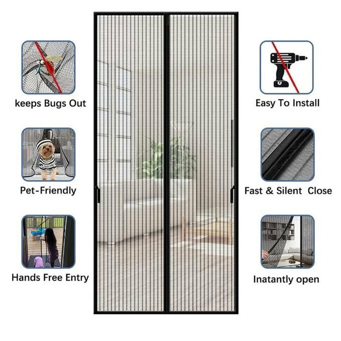 Magnetic insect door net with automatic closure after passing through it. Completely keeps away insects and bugs from your space.