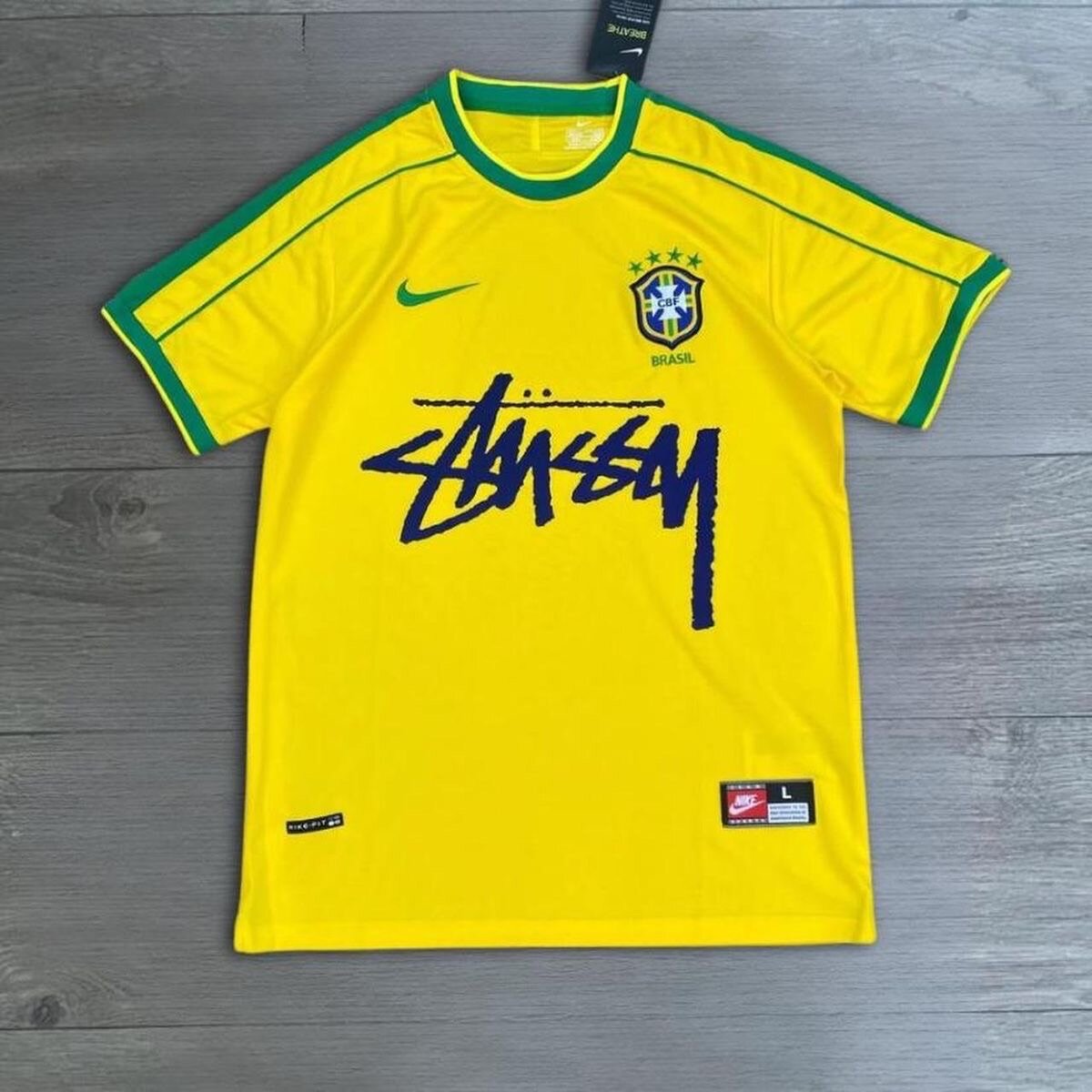 Ce maillot de football jaune allie style et performance. Conçu par Nike et Stussy avec les couleurs iconiques du Brésil, il est idéal pour les fans et les amateurs de modes sportives. Parfait pour les matchs ou un look décontracté.
