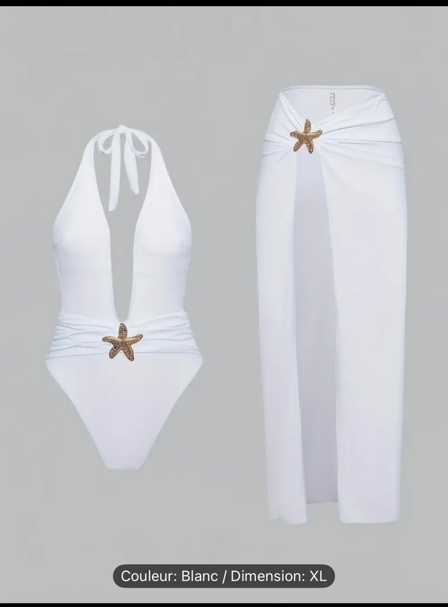 Transformez votre look estival avec ce magnifique ensemble maillot de bain et paréo blanc, orné de détails étoile de mer dorés. Confortable et élégant, idéal pour se prélasser sur la plage ou au bord de la piscine. Taille XL.