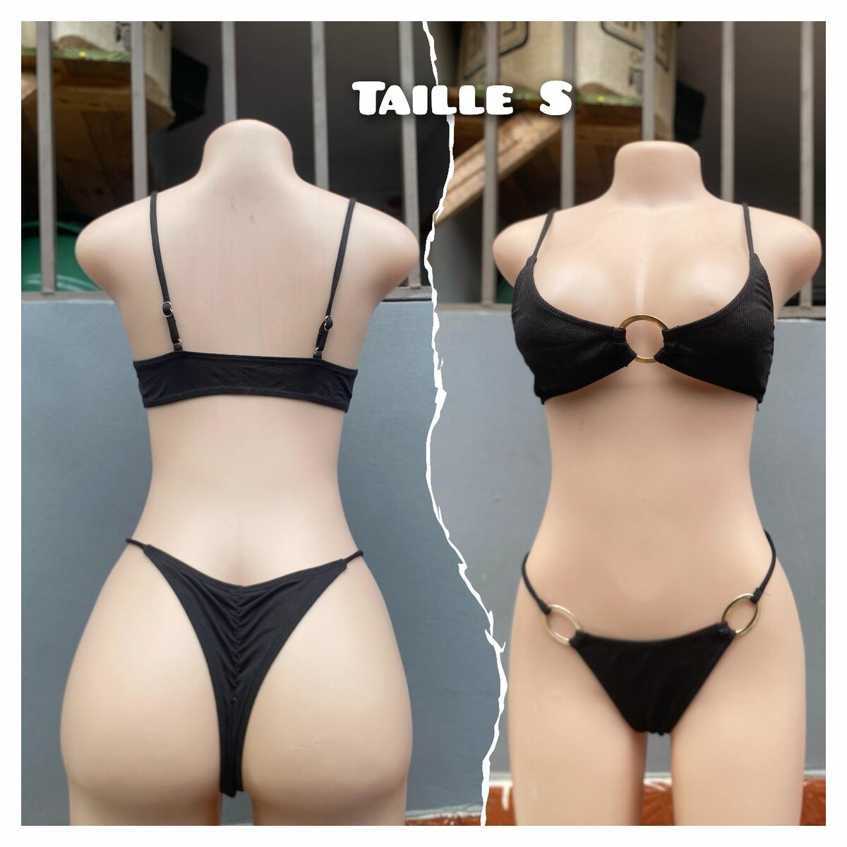 Maillot de bain bikini noir élégant avec anneaux décoratifs. Confortable et stylé, idéal pour la plage ou la piscine. Taille S.