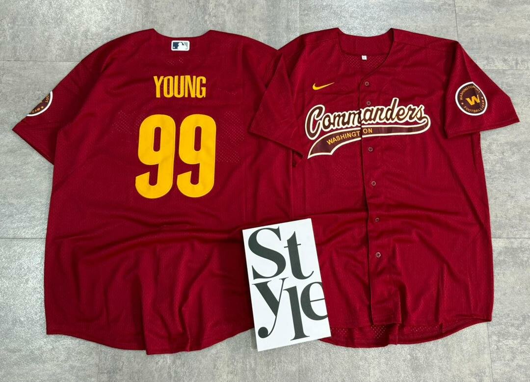Maillot de baseball rouge avec logo "Commanders" et numéro 99. Idéal pour les fans de sport et les événements décontractés. Design confortable et stylé pour afficher votre passion.