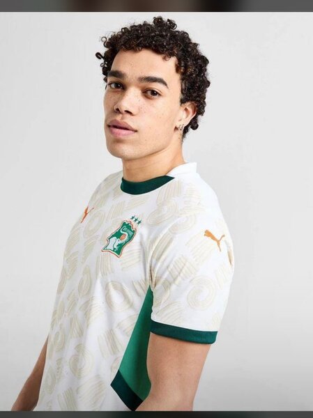 Maillot officiel de l'équipe nationale de football de Côte d'Ivoire. Design moderne avec des détails verts. Idéal pour les supporters et les passionnés de football. Disponible en diverses tailles pour hommes et femmes. Tissu respirant pour un confort optimal pendant les matchs ou le sport en général.