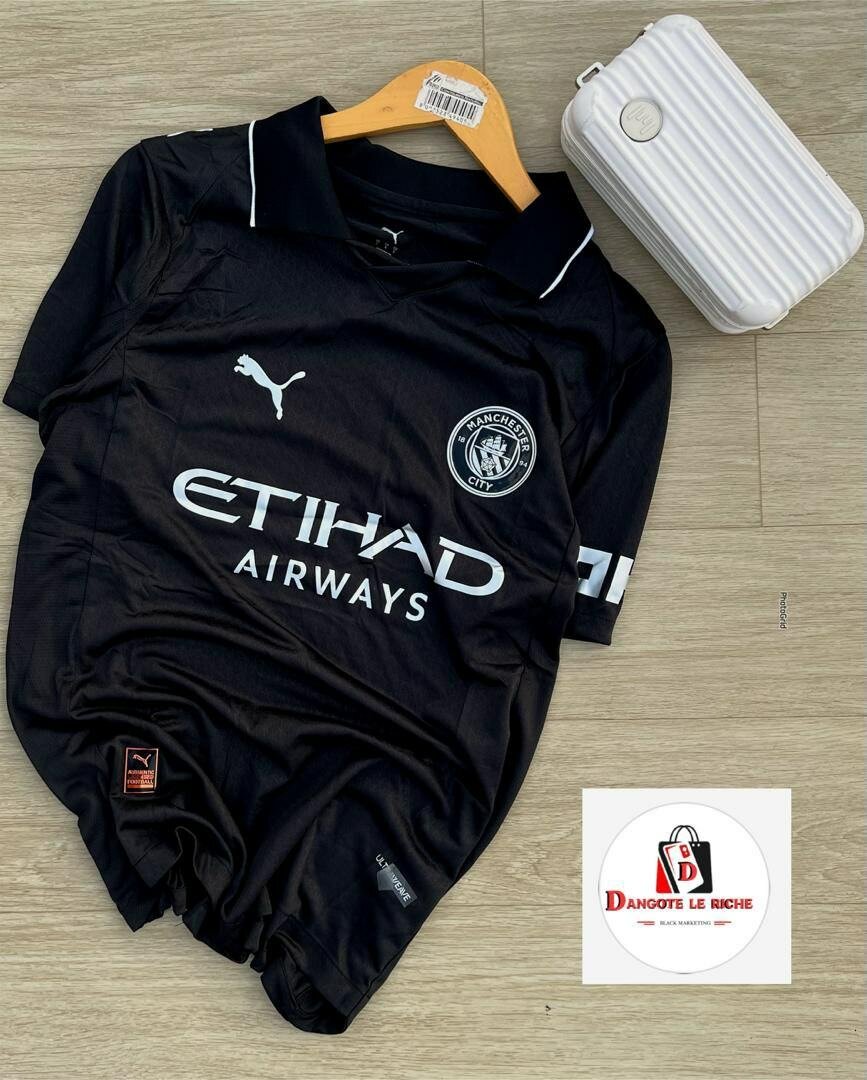 Maillot officiel Manchester City, design moderne en noir, parfait pour les fans de football. Idéal pour les matches ou le sport quotidien, fabriqué avec des matériaux de qualité pour un confort optimal.