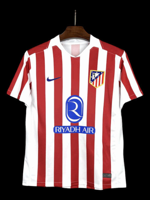 Maillot officiel du club Atlético avec bandes rouges et blanches iconic. Parfait pour afficher votre soutien lors des matches. Design moderne avec logo sponsorisé par Riyadh Air. Idéal pour les fans et athlètes passionnés de football.