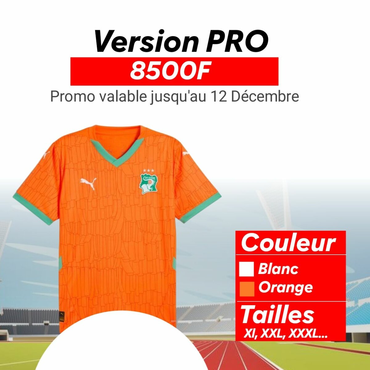 Maillot de football officiel de la Côte d'Ivoire, version pro, avec une conception moderne et respirante. Disponible en orange vif, idéal pour soutenir votre équipe avec style. Un vêtement confortable et de qualité pour tous les passionnés de football.