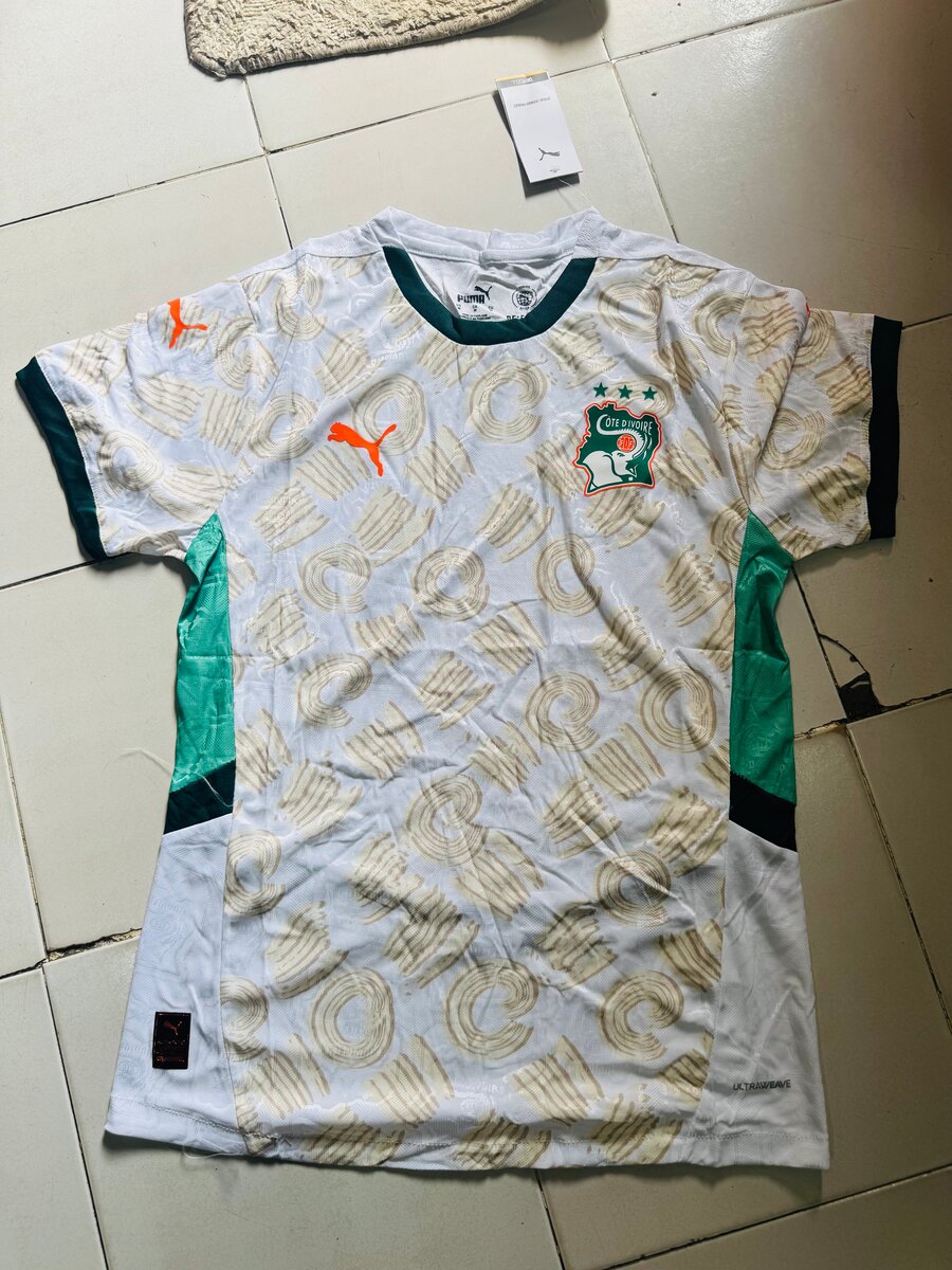 Maillot de football de l'équipe nationale de Côte d'Ivoire. Conçu pour la performance et le confort, idéal pour les supporters et les joueurs passionnés. Tissu respirant avec emblème officiel et logos.