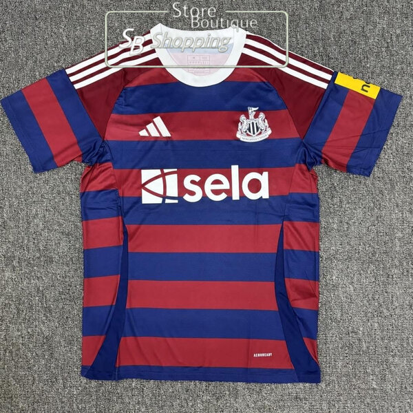 Adoptez un style sportif avec ce maillot de football rayé bordeaux et bleu. Idéal pour les fans de sport, il allie confort et tendance.