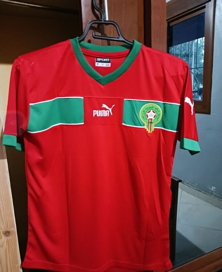 Maillot officiel du Maroc par Puma, idéal pour les fans de football. Confortable et stylé avec design rouge et vert. Parfait pour supporter votre équipe lors des matchs ou pour une tenue décontractée.