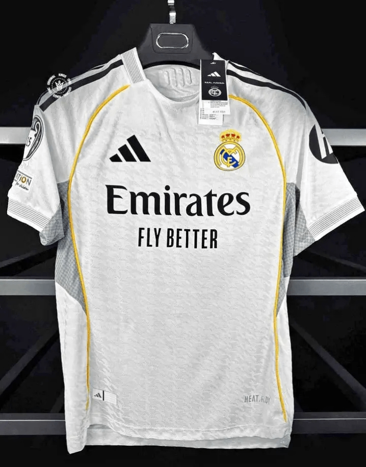 Maillot de football officiel du Real Madrid, fabriqué par Adidas. Design élégant avec des détails jaunes et noirs. Parfait pour les fans du Real Madrid.