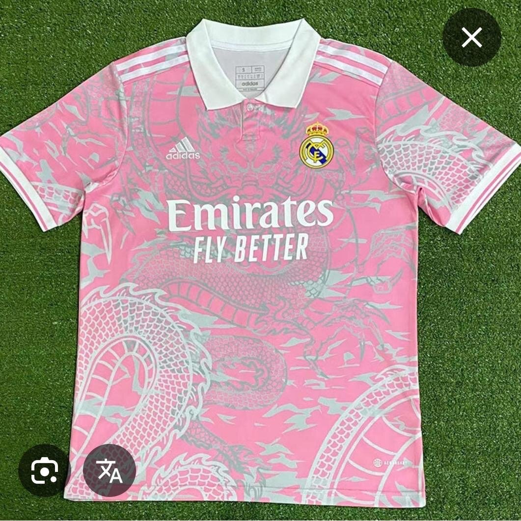 Maillot de football Réal Madrid rose avec motif dragon. Conçu pour offrir confort et style aux passionnés de sport. Tissu respirant idéal pour l'entraînement ou un look décontracté. Affirmez votre soutien à l'équipe avec ce maillot unique.