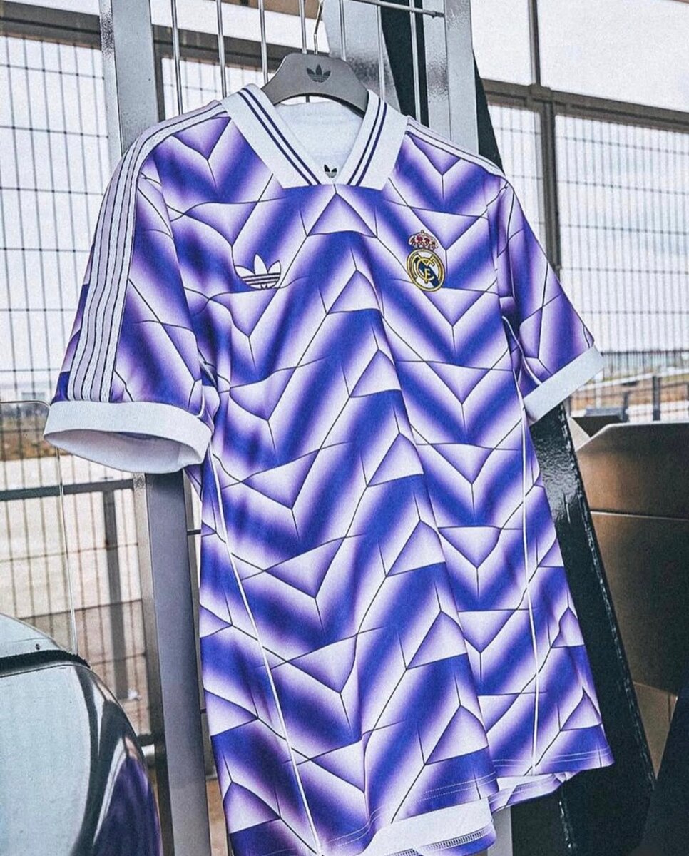 Découvrez le maillot rétro du Real Madrid, un incontournable pour tous les fans de football. Son design aux motifs géométriques violets et blancs apporte une touche d'élégance et d'originalité. Idéal pour afficher votre passion au quotidien ou en match.