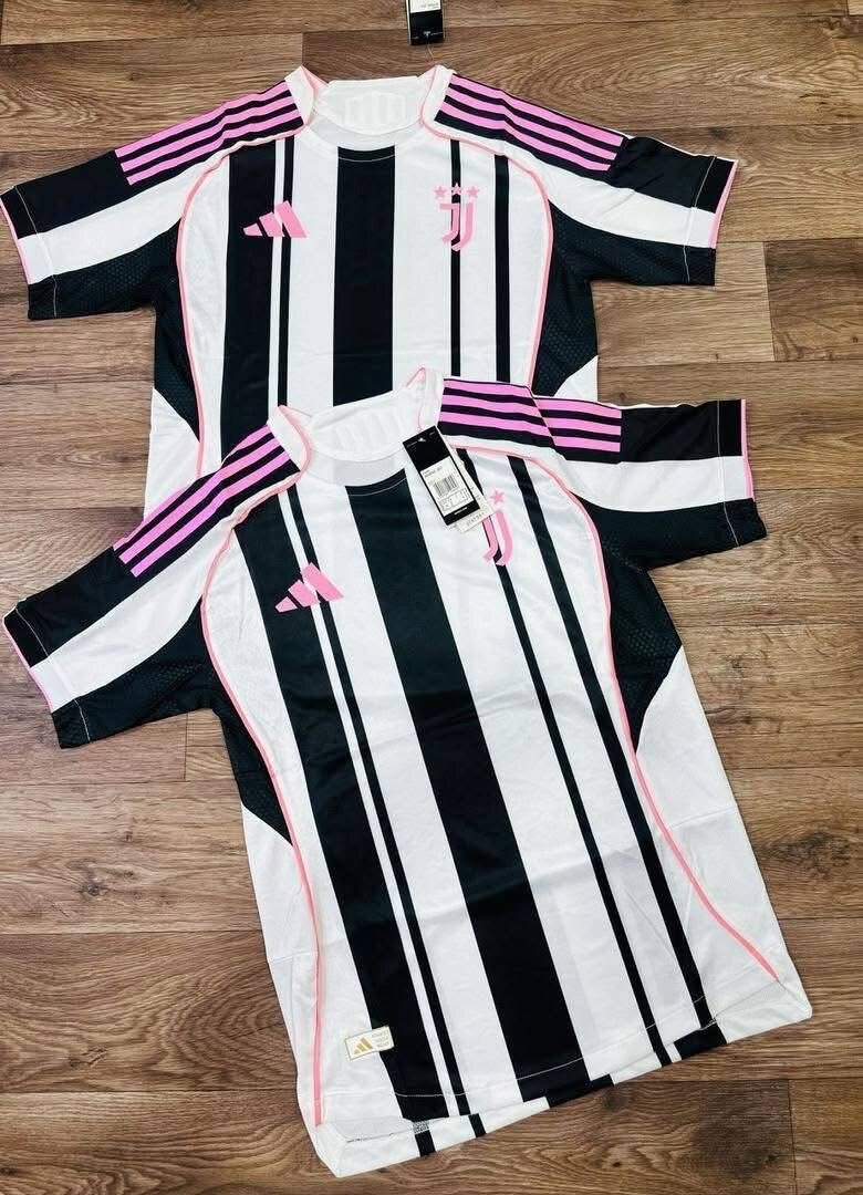 Maillots de football Juventus pour fans, avec rayures noires et blanches emblématiques et détails roses. Tissu respirant idéal pour le sport ou le quotidien. Montrez votre soutien à votre équipe favorite avec style.