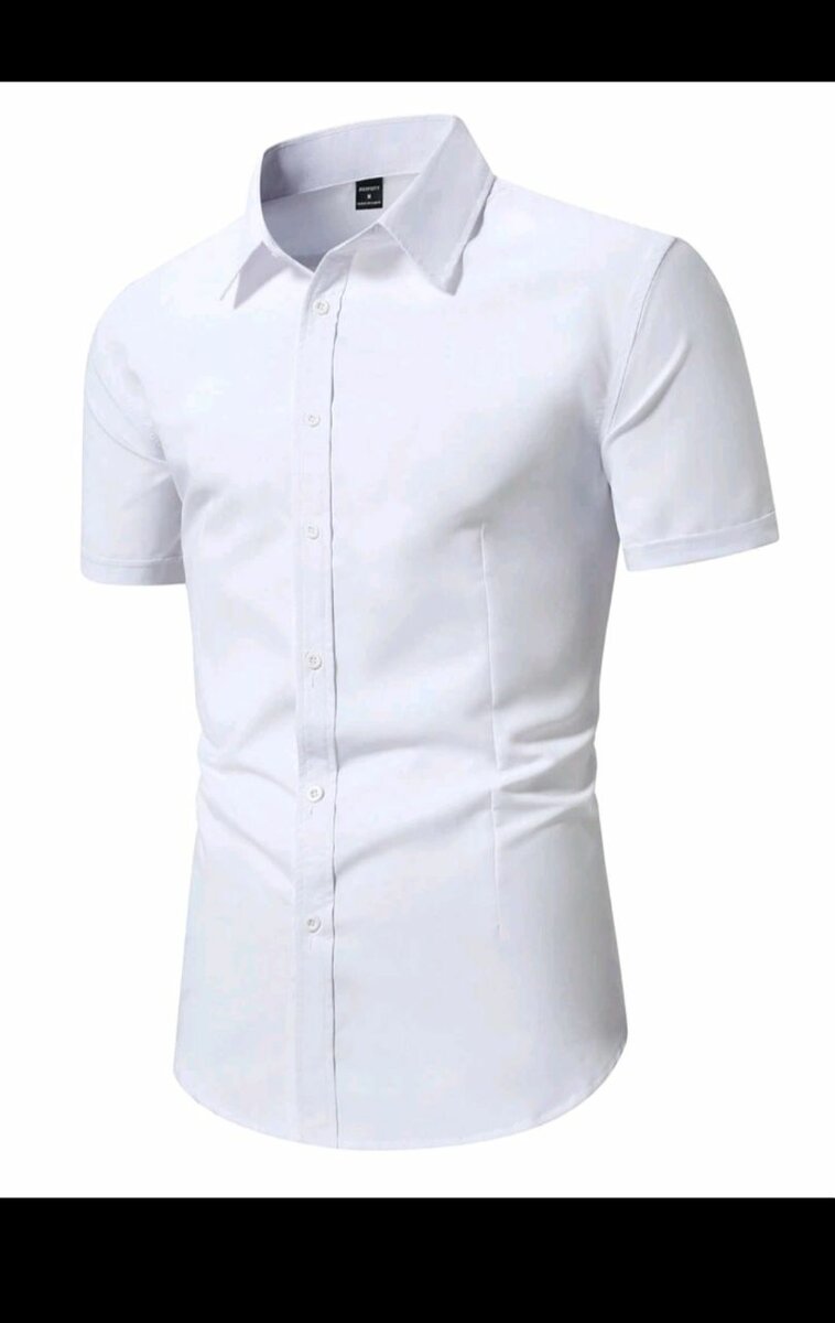 Chemise estivale à manches courtes, style commuter décontracté. Design uni, blanc classique, coupe simple et élégante avec fermeture à boutons. Idéale pour le travail ou les sorties. Taille 50 L.