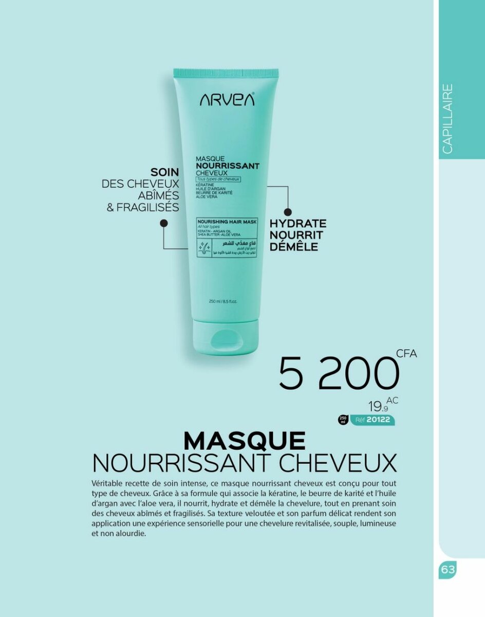 Revitalisez vos cheveux abîmés avec ce masque nourrissant intensif, adapté à tous types de cheveux. Formulé avec du beurre de karité et de l'huile d'argan pour hydrater et démêler facilement. Parfait pour des cheveux lisses et doux.