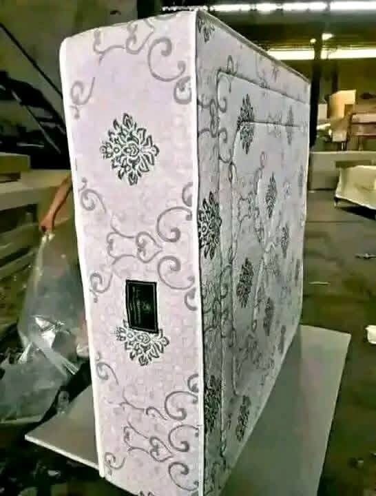 Matelas à ressorts de haute qualité avec une housse décorative blanche et motifs gris. Confort et soutien pour un sommeil réparateur.