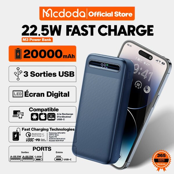 Chargeur rapide 20W Mcdodo, compatible avec Android et iPhone 6-14. Bénéficiez de la technologie Power Delivery pour une charge efficace via le câble USB-C 36W. Idéal pour la maison ou le bureau, il garantit une charge rapide et optimale de vos appareils, sans chauffe, sans surcharge électrique.