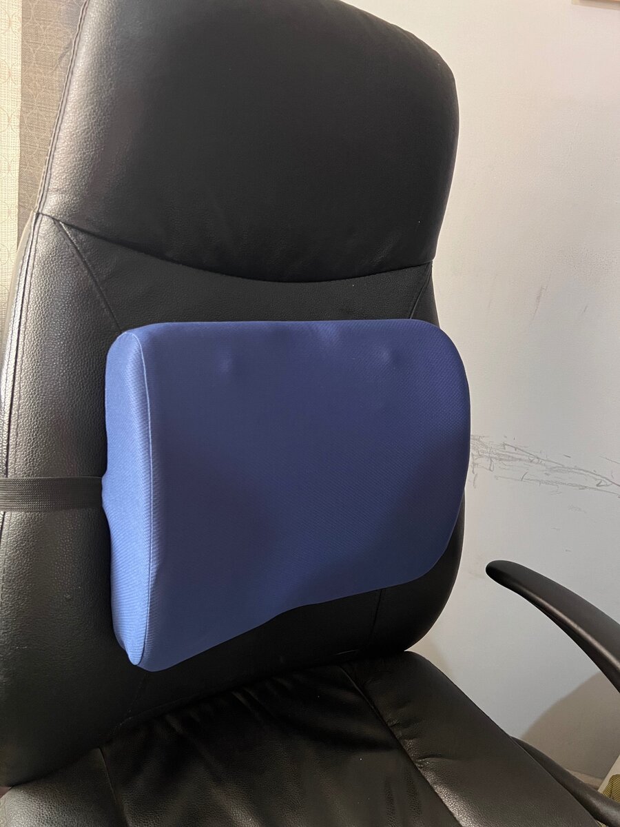 High quality memory foam back rest for lumbar support. Elastic band ant the back fits office swivel chairs. Blue cover is removable for washing.