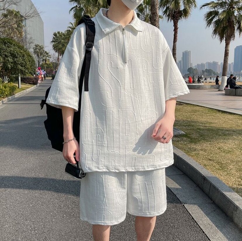 Men's Polos Shirts Set Short Sleeve Shorts Men's Zipper T-Shirts-White Size-Medium to XXXXXL