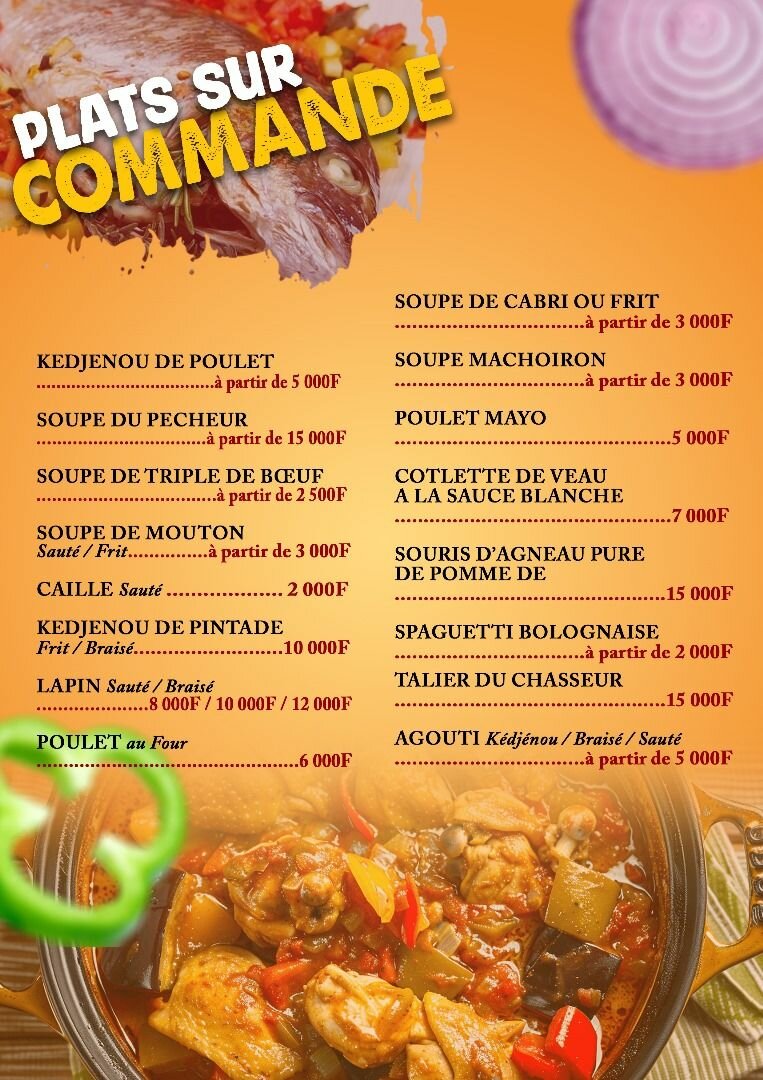 Découvrez des plats exquis comme le Poulet Sauté, la Soupe du Pêcheur et le Lapin Braisé. Parfait pour des repas délicieux en famille ou entre amis.