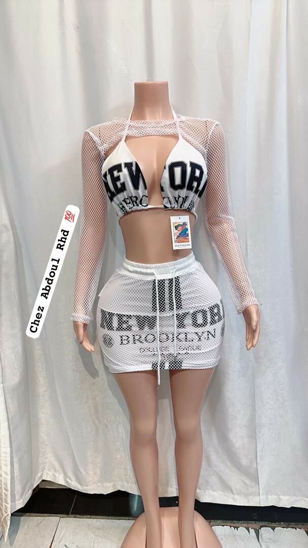 Stylish mesh two-piece set featuring a crop top and mini skirt. Perfect for a bold, fashionable look. Available in multiple colors, ideal for clubbing or summer outings. Comfortable and breathable material.