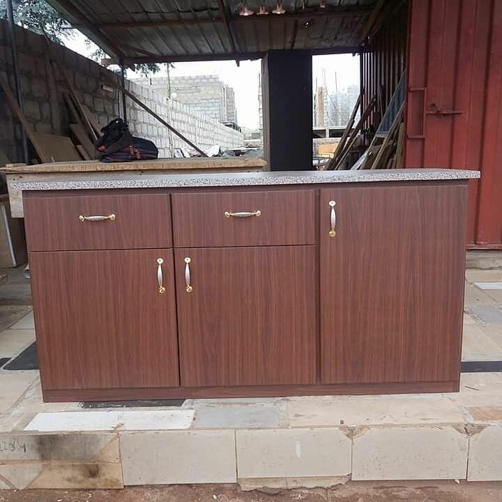 Meuble de cuisine robuste avec un dessus en granit, idéal pour la préparation des repas. Fabriqué en bois marron avec des finitions dorées.