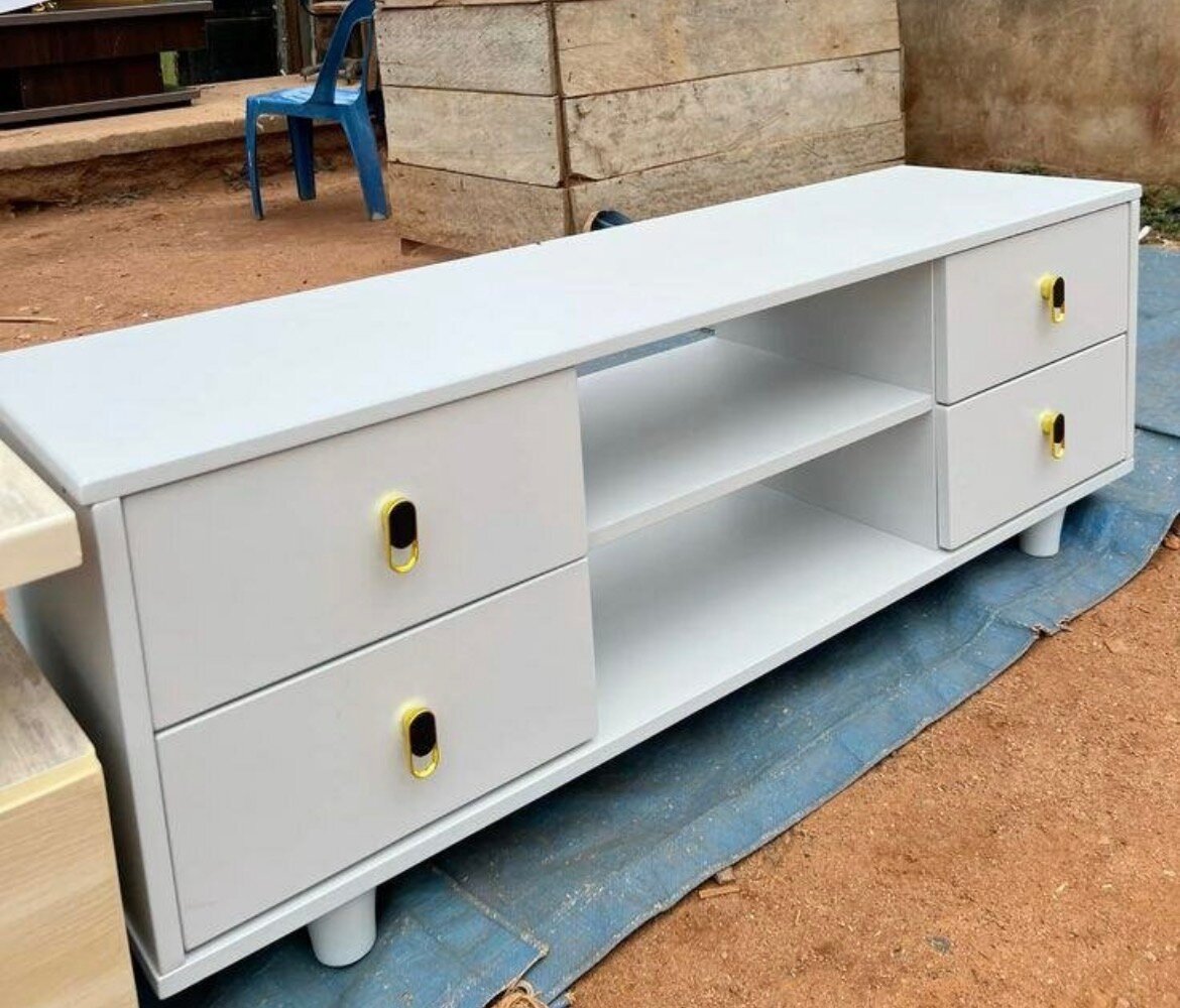Meuble TV élégant et fonctionnel, parfait pour organiser vos équipements multimédias. Doté de plusieurs tiroirs et d'une étagère centrale, il est idéal pour votre salon.