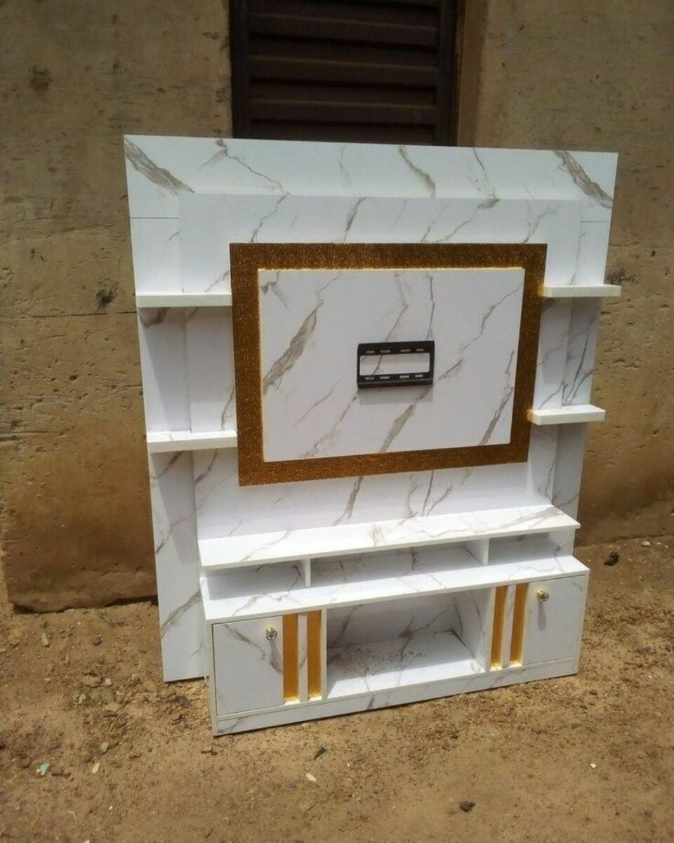 Meuble TV élégant avec finition marbre blanc et accents dorés. Etagères spacieuses pour un rangement organisé et un style raffiné, idéal pour votre salon.