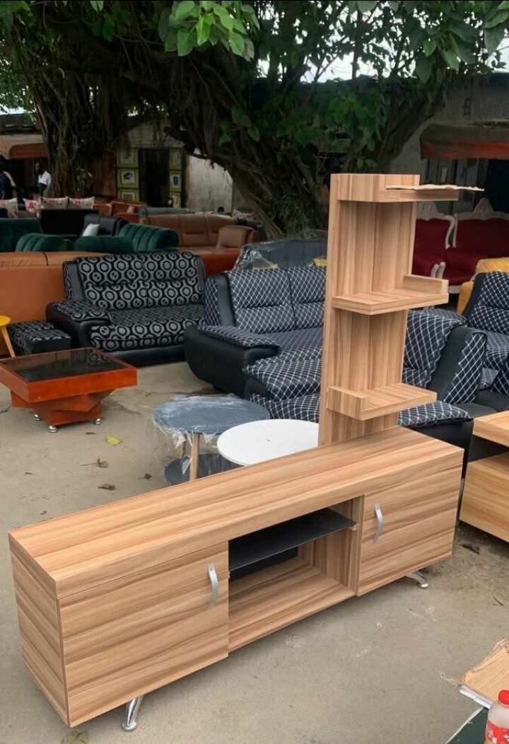 Meuble TV moderne en bois avec étagère intégrée. Conçu pour ranger vos équipements multimédias et décorations. Fabriqué en bois de qualité, il est robuste et élégant. Parfait pour votre salon.