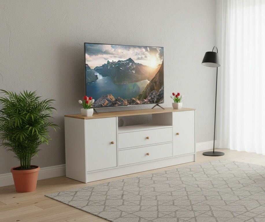 Optez pour ce meuble TV en bois moderne, parfait pour tout salon contemporain. Avec ses tiroirs spacieux et son espace ouvert, il offre un rangement pratique pour vos appareils multimédias et accessoires.