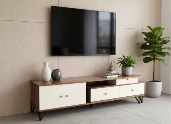 Élégant meuble TV en bois avec rangements pour votre salon. Design moderne et robuste, parfait pour organiser vos équipements et accessoires.