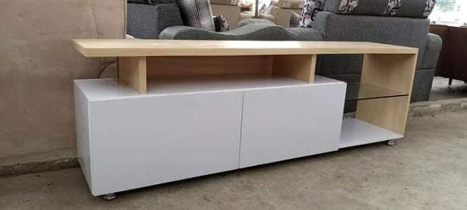 Élégant meuble TV moderne en bois et blanc, parfait pour organiser votre espace de divertissement. Offrant des étagères ouvertes et des rangements fermés pour vos appareils multimédias et accessoires. Idéal pour une maison stylée et fonctionnelle.