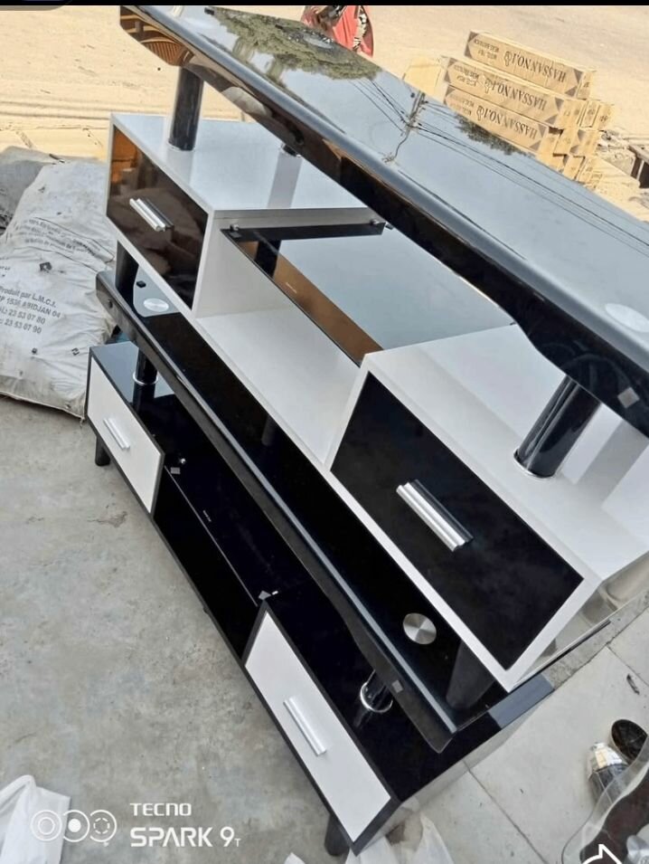 Meuble TV élégant avec rangements pour votre salon. Design moderne, finitions noir et blanc, plusieurs tiroirs et compartiments pour un rangement optimal. Facile à assembler et robuste.