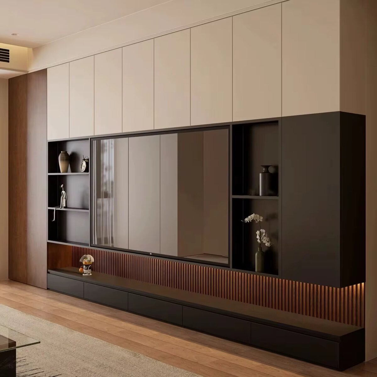 Meuble TV mural moderne en noir avec rangements. Design épuré et éclairage intégré. Fabriqué à partir de matériaux de haute qualité pour une durabilité exceptionnelle. Idéal pour les salons contemporains.