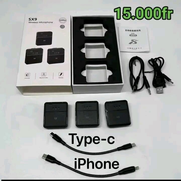 Découvrez le microphone sans fil SX9, idéal pour les présentations, les vidéos et l'enregistrement audio. Compatible avec les appareils iPhone et Type-C. Contenu : 3 microphones, câbles de recharge et manuel d'instruction.