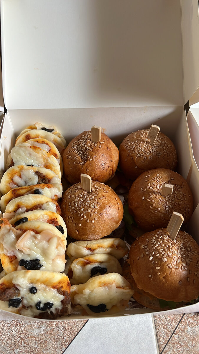 Delicious box set of mini burgers and pan-fried dumplings, perfect for catering or a quick snack. Made with high-quality ingredients and presented beautifully.